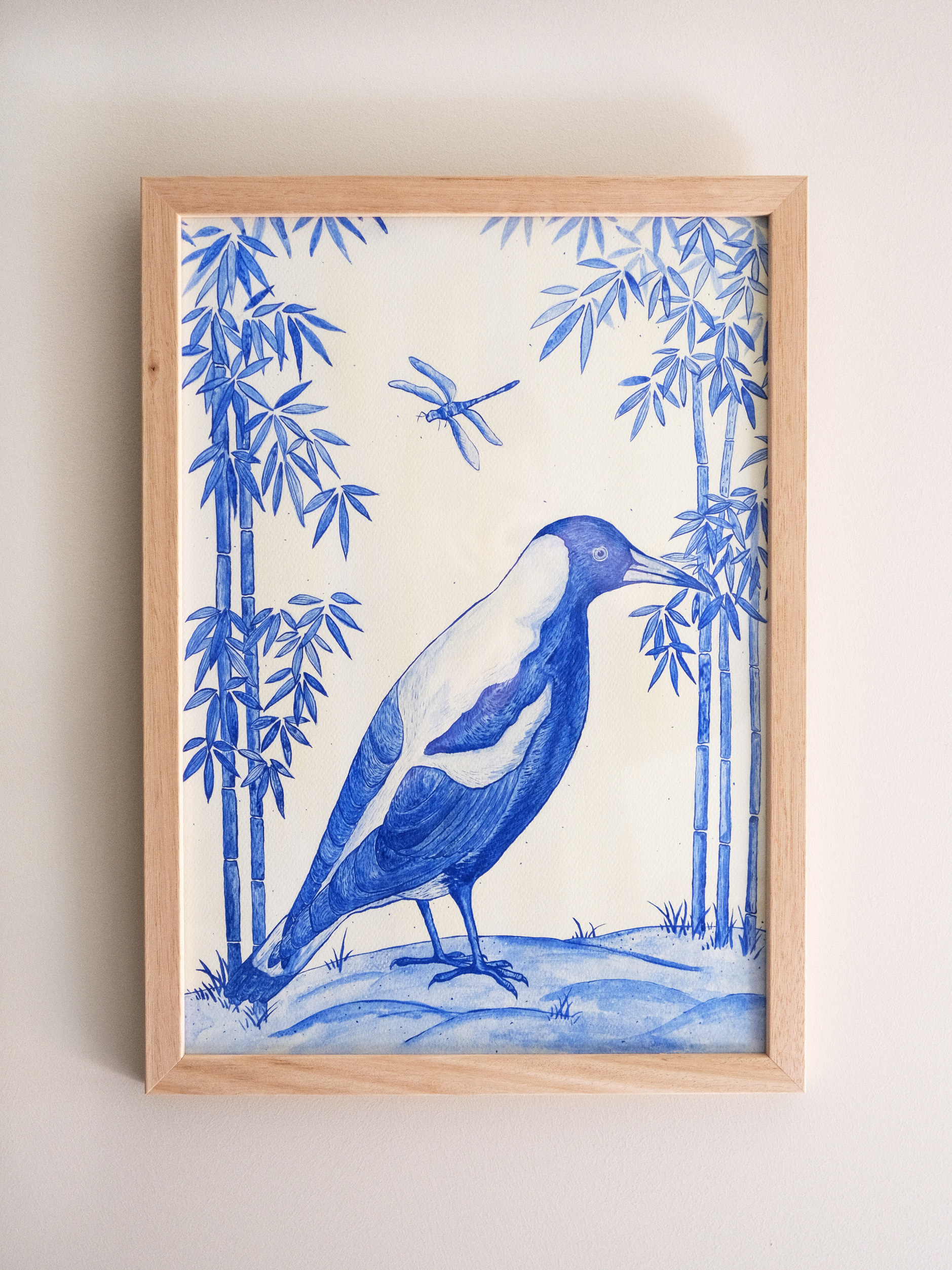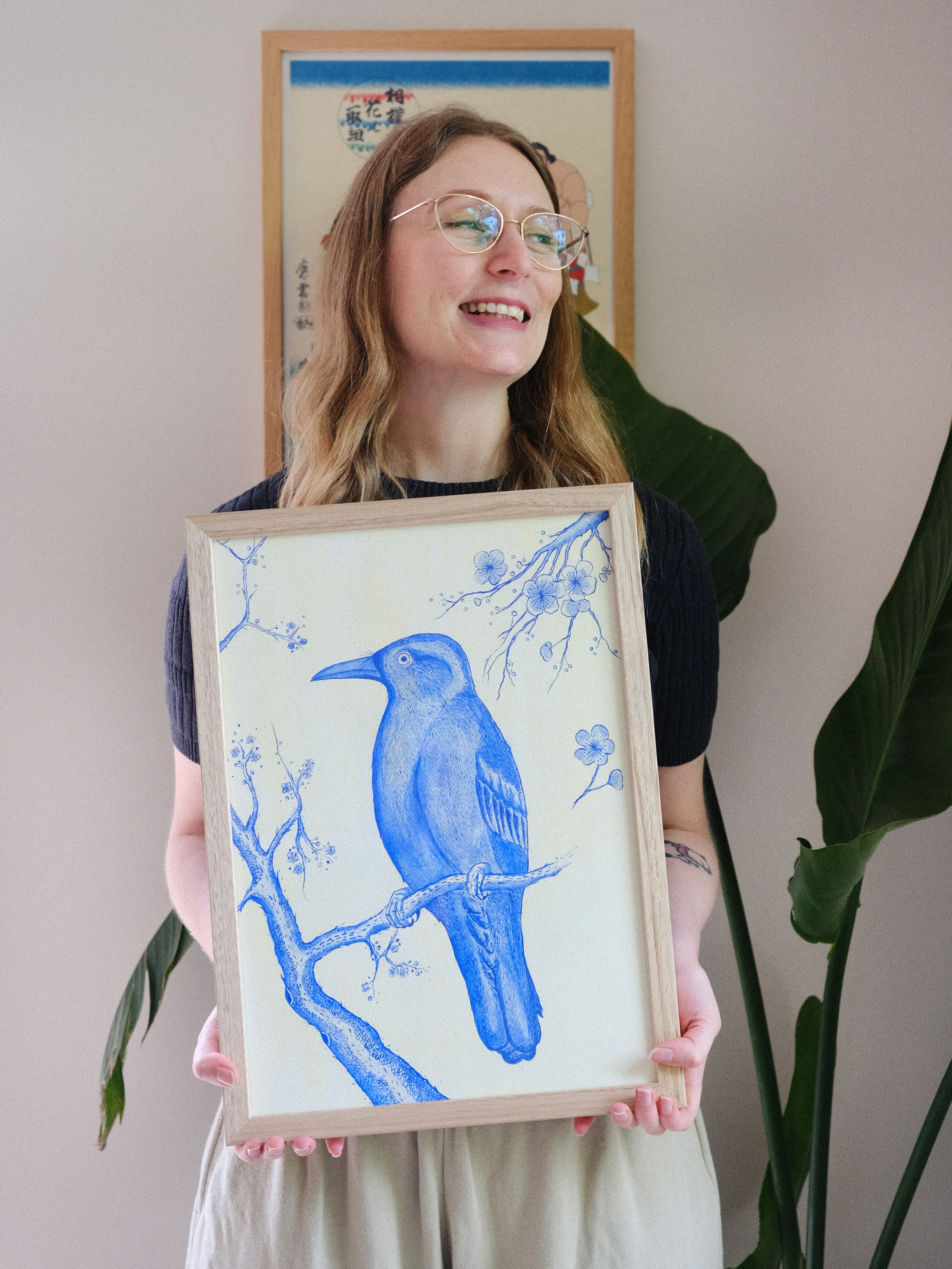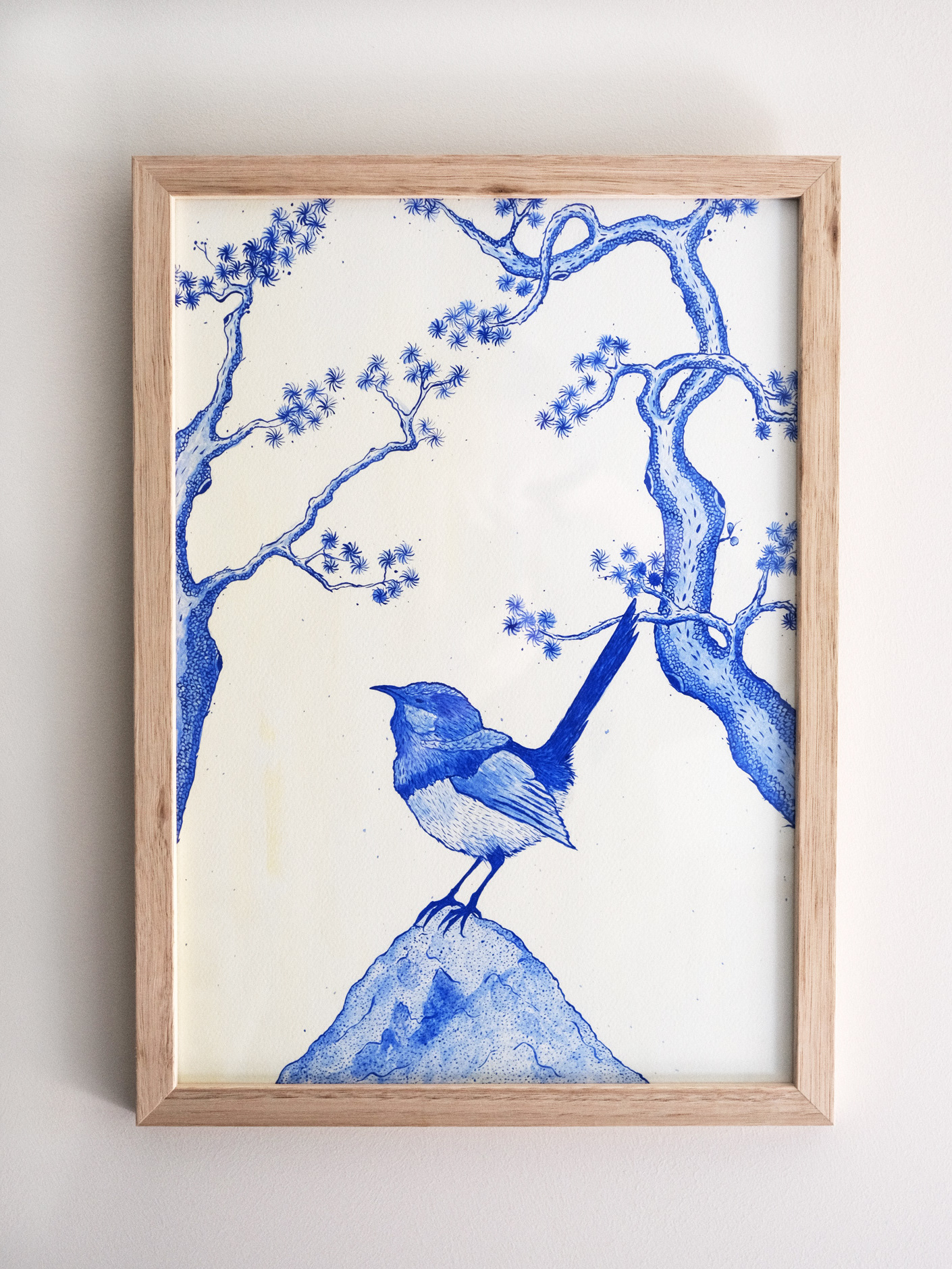 Carly works primarily with gouache on watercolour paper to create ephemeral worlds inhabited by Australian birds. Her style is influenced by antique East Asian pottery, referencing her earlier life in Japan collecting and selling artisan ceramics.